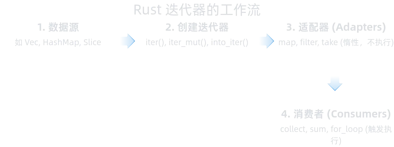 关键特性:惰性 (Lazy) 是 Rust 迭代器最重要的特性。当创建一个迭代器(例如调用 .iter())或链式调用函数(例如 .map())时,实际上什么都没有发生。只有当你调用一个“消费者”方法(如 .collect() 或在 for 循环中使用)时,迭代器才会真正开始工作。